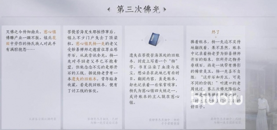 以上就是燕云十六声第三次佛光任务的完成方法分享,这个任务整体还是比较简单的,物品和人物都不算很难找,想完成任务的小伙伴,可以依照文中的步骤来做,相信大家都能完成任务获得奖励。