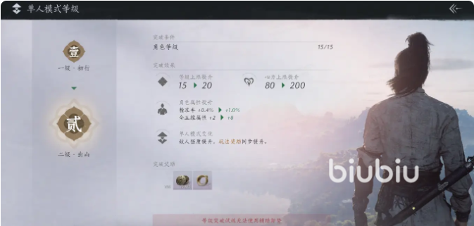 而大家第一次面临突破的时候,是在15级的时候,需要大家在限定的时间之内,将三轮的敌人都击败,将战力装备提升之后,准备充足之后再去挑战。等级上限突破之后,心力上限,角色的属性都会得到提升,同时还可以得到货币以及一些道具作为奖励。只有完成突破,武学以及装备才能进一步提升。