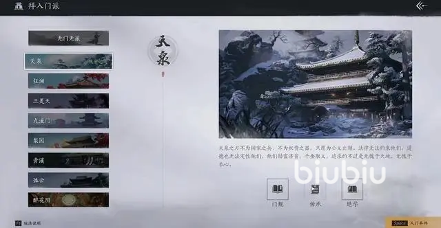 在设定当中是有12种门派的,初期是小伙伴们可能都是无门无派,但是后续是可以自由选择想要加入的门派的,自由度比较高。不同门派的风格属性不一样,可以选择自己更中意的门派去发展。比方说,墨山道就擅长使用墨水来攻击和防御;醉花阴更擅长打控制,通过巧妙的手法让对方陷入困境;清溪使用扇子武器,对医术方面比较注重,能给队友提供辅助治疗的作用,还有三更天,梨园,九流门等等可以选择。