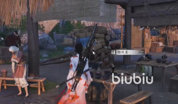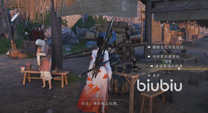 在选择第三个请前辈喝酒的选项后,就可以触发任务,触发后接到任务后需要根据任务指引前往后边的酒架上拿一坛酒,随后需要再与独饮客对话,这次对话中会出现一个比拼的选项,大家需要选择。