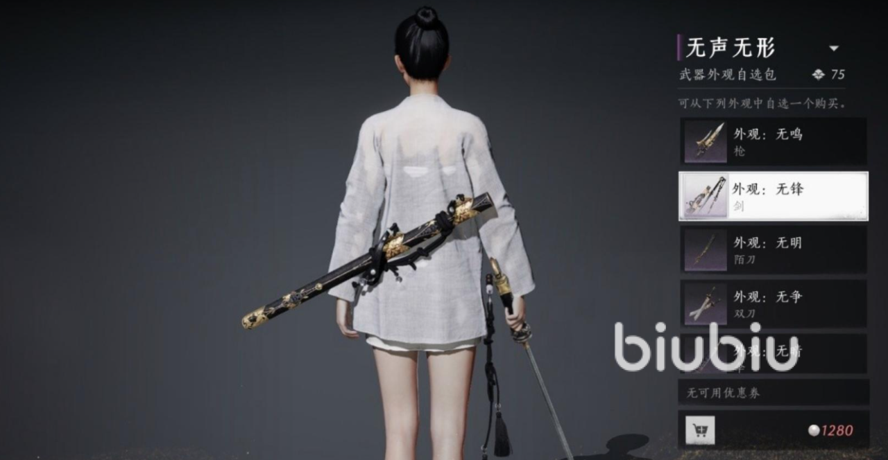无声无形系列的武器皮肤,可以在商店里购买,售价都是1280长鸣珠。剑的外观有“无锋”,如图所示,剑柄和剑鞘上有金色的装饰,显得非常精致,剑的末端还系着一些黑色的绳子和珠子。再有就是套装里面的这个“斩金翎”,剑柄和剑鞘也上有复杂的花纹和装饰。