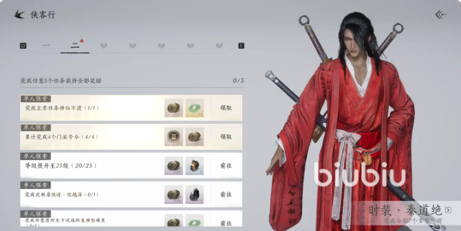 先来看侠客行任务,从右上角点击第五个小的图标,就是一个翻开的书本,就能进入到该人物里面了,其实这就是新手任务,新手将七日成就中完成五个,就能拿到所有的奖励了,比较简单。
