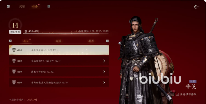 ”战令每日任务”也不能忘记,通过界面右边的第一个图标,就进入到“战令”的页面,再点击任务,就能看到今日有哪些任务了,战令的每日任务其实是固定的四个,难度比较低,很快就可以清完的。