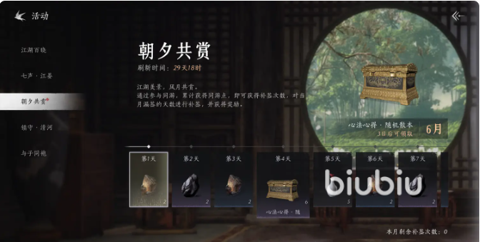 ”七声·江晏”作为第二个日常任务,通过右边第四个小燕子图标就能进入到“活动”界面,就可以找到这个任务了,这可以理解成新手的签到活动,每天签到就能拿到每日奖励,最后可以领取到衣服外观的奖励。”朝夕共赏”则是另一种签到,是日常的签到活动,每日签到礼包,就在前一个活动的下面。
