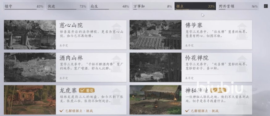 “侠迹”可以理解为是主线boss,可以重复刷获得奖励,众生、万事知则可以理解为一些故事支线。然后游历、见闻这些则是地图上每个地区的收集记录,不得不说探索这部分真得很肝。