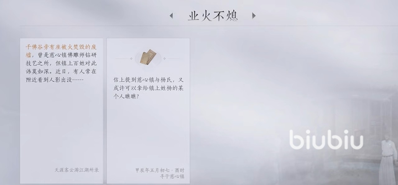燕云十六声的业火不熄,是位于清河地带的一个副线任务。此任务指引玩家在千佛谷的残垣断壁中寻觅一封未被完全焚毁的家书,并在慈心镇的夜晚将此信件交予NPC杨善婆,通过对话剧情来完成任务。整体而言,此任务的操作难度较高。