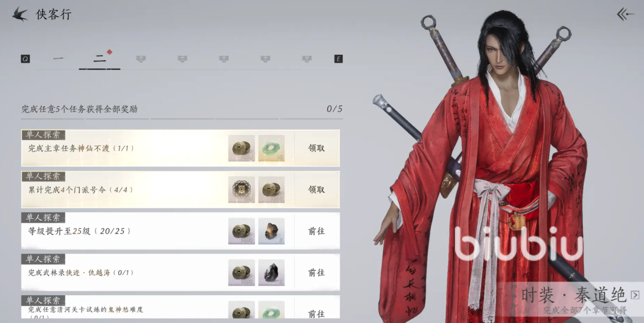 在界面的右上角点击第五个小图标,样式为一个翻开的书本,点击后就能进入到侠客行,随后大家能看到各式各样的小任务,每个都会好完成,大家只需要选取五个去做就能领取所有奖励,其实就有点类似于新手七日成就。