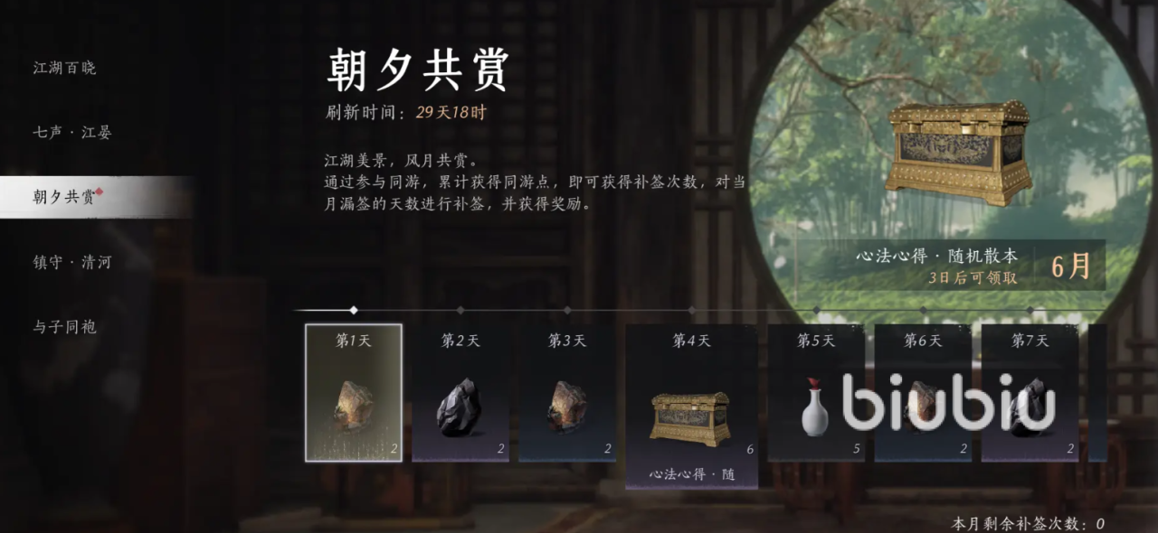 还是在右上角点击图标四,进入到活动中,能在刚刚的“七声·江晏”下面看到“朝夕共赏”,要做的事也很见到,同样就是每天签到领取礼包,点击第一个图标能进入到“战令”界面,点里面的任务就能看到每日任务。