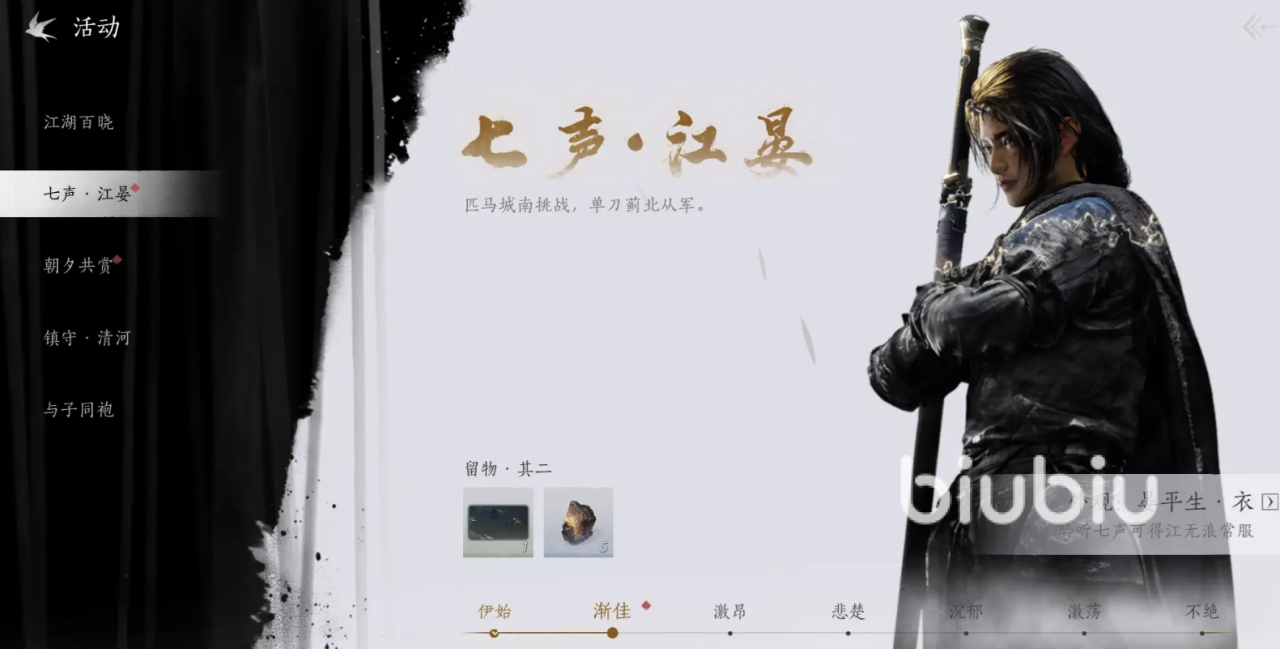 我们如果点击右上角的第四个图标,样式为一个小燕子,就会进入到活动界面,这里呢个看到一个叫做“七声·江晏”,这个大家可以理解为新手七日签到礼包,只要连续领取满七天就能拿到讲述江叔的衣服外观。