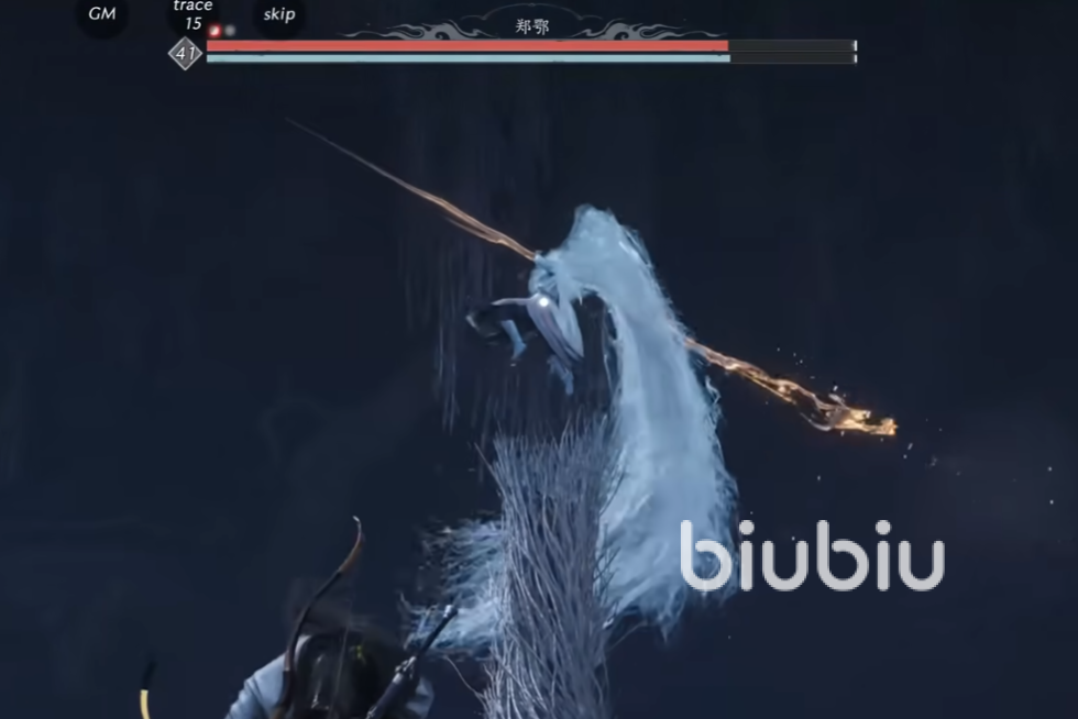 到了第二阶段之后,他会直接站在地面上的树桩,并将自己的武器更改为长枪。长枪的攻击范围很广,一上来就会放大招并蓄力放一些枪波攻击我们。这时自然我们无法与他匹敌,需要不断的躲避才行。接着他还会继续放几道扇型枪波,简直恐怖如斯。