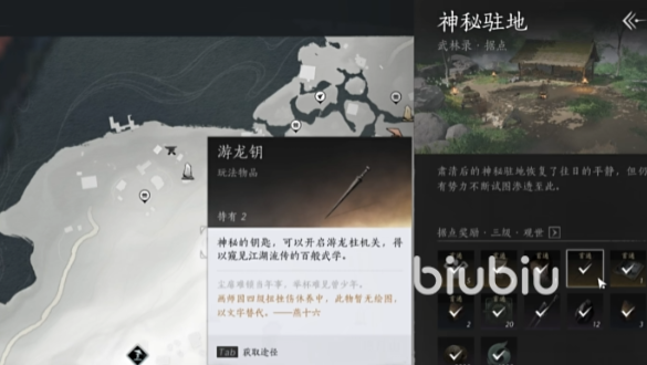 当然,也不是什么武学都能学,以剑法为例,只能偷到孤云门派的“积矩九剑”武学。消耗的游龙钥匙可以去驻地刷,也就是地图上红牌子的地方,驻地首通有给游龙钥匙。