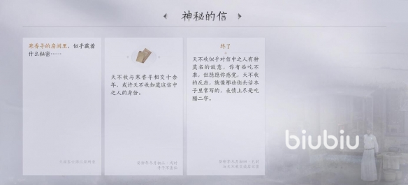 这个探索任务其实整体的难度也比较小,在了解流程的情况下做起来会非常高效。首先第一步就是找到封,才能将其教给对应人物。步骤一前往寒香寻的房间,在她的房里面寻找一下,就能找到一封陈年旧信,厢房具体的位置也在下图当中标明出来了,这样方便大家寻找,接下来的一步也非常简单,去往不羡仙的店里,找到天不收这个NPC,只要将这封信送个他就能完成任务了。同样能获得+10的清河探索度。