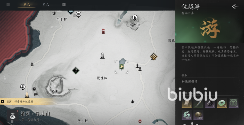 要想得到飒沓流星,肯定首先得找对地方,大家打开地图去到清河·隐月山,找到下图中的位置,然后去找到一个老渔翁,靠近他和他进行对话,对话完毕后你就能开始仇越海这个任务了,这是不可略过的第一个步骤哦。