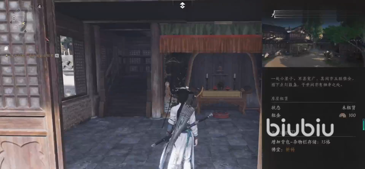通过引导得知,这样的房屋是能进行租赁的,目前看来,这个开封有两片不同的区域,一个是宅院,另一个则是居舍。如果是选择居舍,那么只需要消耗100的短陌钱就能租赁,储存空间15格,增加一个佛堂,一个祈祷。
