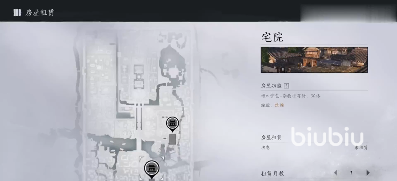 宅院看起来大很多,甚至可以洗澡,并且增加存储空间30格,但是租金也贵很多,需要1000金,当然以上说的价格都是月租。进入其中可明显的看到,居舍是相对比较简单的,只有一个房屋,两层的小房子;宅院则是个很大的院子,房屋数量比较多,还有厨房甚至杂物间,房屋的空间很大。