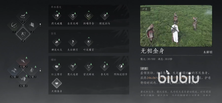 每次使用会消耗30点的精元,调息也就是冷却要30秒,使用后可以获得10秒的金身状态,得到与外功攻击和外功伤害挂钩的护盾值,并且在金身持续时间内有很强的抗打断能力。在使用一些强力的武学技能前可以先开这个,这样就能确保招式不会被打断。