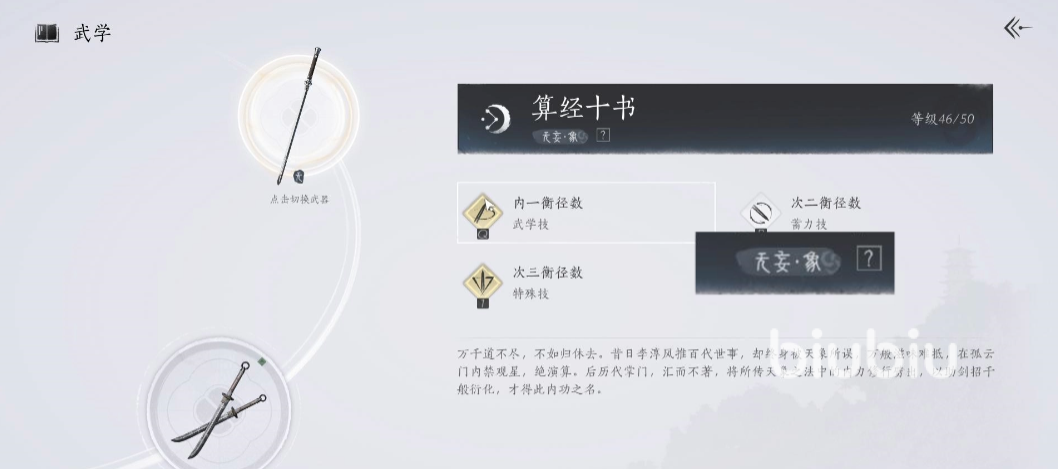 算经十书是无妄象类剑法,擅长对群,用于解决大量敌人的堆积,主要造成大量万象吟伤害。武学技“内一衡径数”,两次连击使用会使敌人遭受五段伤害,并给予敌人剑花效果,最多叠加一次,该效果会在敌人身上存在8秒,然后自动爆炸并造成损伤。