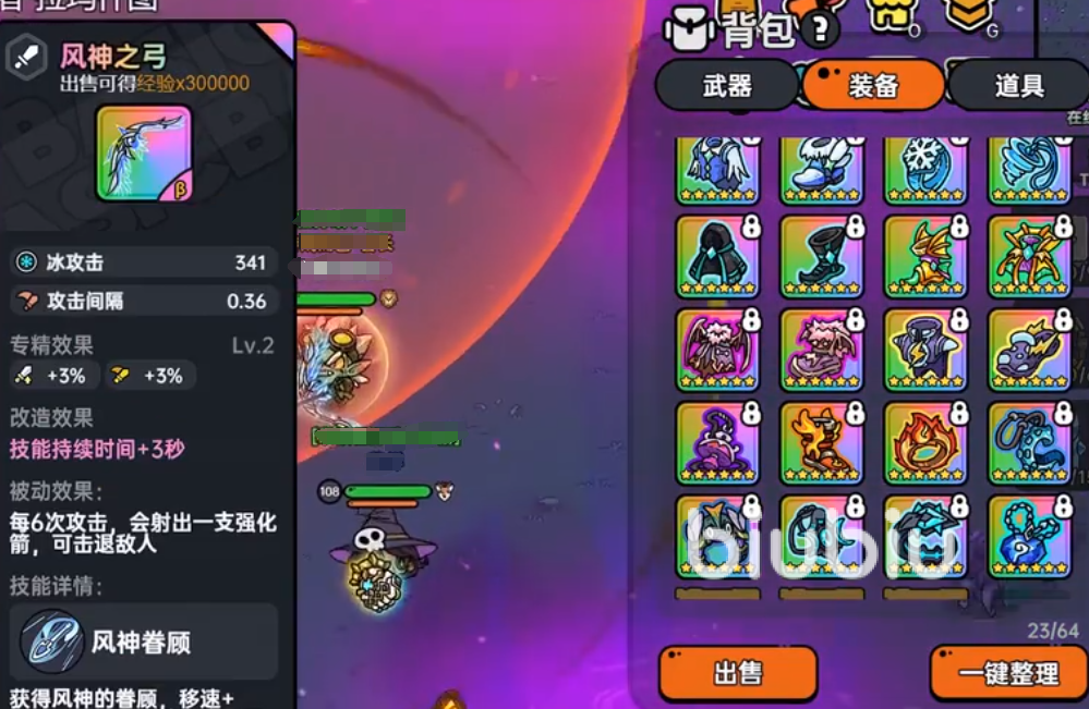 推荐使用装备魔龙套,2件魔龙套效果是打pvp的对玩家伤害增加15%,4件魔龙套会增加一个对怪物boss伤害增加20%的效果,而且每隔一分钟获得一个免疫护盾。武器三把装备推荐带风神之弓、雷电斩、生命之拥法杖。其中风神被动效果每6次攻击就会发出强化箭,击退一次敌人,主动风神眷顾能提升200移速,以及翻倍的攻速。生命之拥在组队的时候比较好用,主动技能缓慢愈合指定一个队友持续回八秒HP。