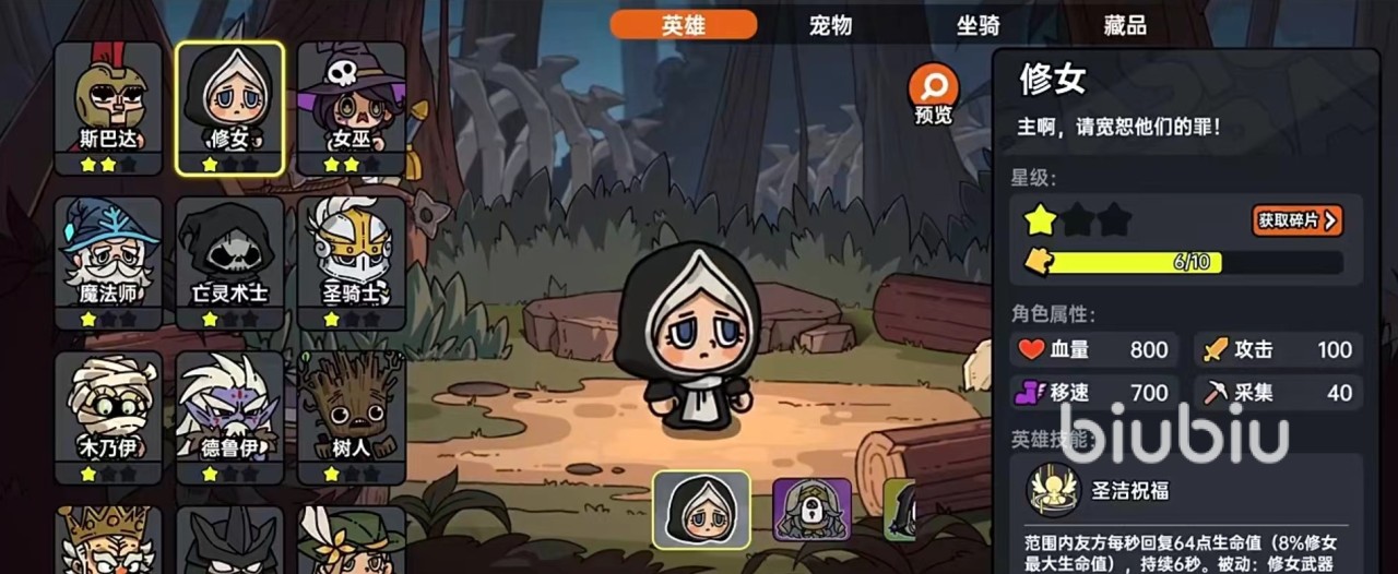 首先是在新手角色选择方面,小编比较推荐修女、炸弹人、树人和圣骑士等这些角色。普遍具有无敌回血等技能,容错率比较高。例如修女技能圣洁祝福,可以为范围内的队友恢复血量,且持续进行恢复,还有被动效果,使装备带来的治疗加成,血量多了自然容错也就高。选好角色之后就是接下来的开局升级,有两种路线可以选择,第1条是比较适合懒人的路线,就是尽量躲避一切怪物,先砍树,挖石头和粘土等资源,解锁农田,然后直接按照种田挂机的形式去升级,毕竟游戏里的玩法很多,并不一定非要去打怪和与其他人战斗。等级高了会解锁高级农田,建议在主城附近进行,这样可以防止受到骚扰。