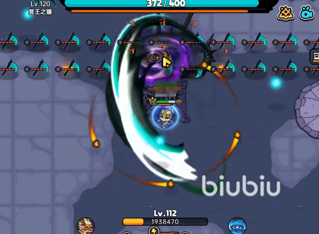 二星冥王放技能的频率不高,玩家清理完一波飞镖之后,冥王就会有数秒不动的状态,此时可以切换一些攻速高的弓箭近身放技能输出。当玩家刷到第四十管血时,冥王就会放出两排横向的小镰刀,注意此时走位,不要在红色区域之中,否则就会被突然出现的镰刀割掉。小镰刀一共有11×2个,每个镰刀有五格血,每命中一次掉一格血,因此想快速磨掉,此时刻装备要换回异度旋刃。