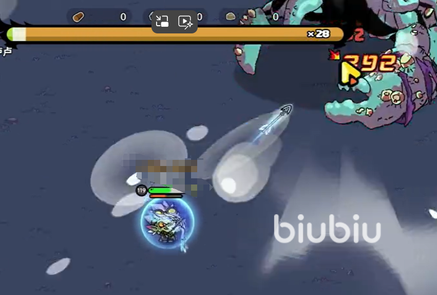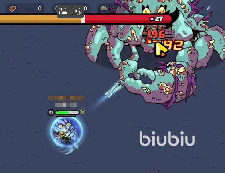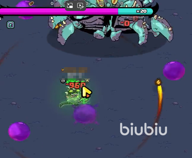 然后就是一些回旋技能,boss会短暂地进行吸水,对全屏幕的玩家造成漩涡伤害,这个唯一能躲避的位置就是在boss的附近,玩家需要尽可能地跑去boss身边,最后boss会进入无敌状态,这个状态下需要使用四个蓝色泡泡击中便能解除无敌状态,将其击杀,时间要快,否则boss会恢复很多的血量。