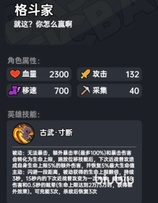 格斗家的基础技能是古武,这个技能的效果是格斗家是无法进行暴击的。所有额外的暴击率和暴击伤害都会转换成生命上限,在施放了位移技能之后,下次的普攻将会额外造成生命上限5%。