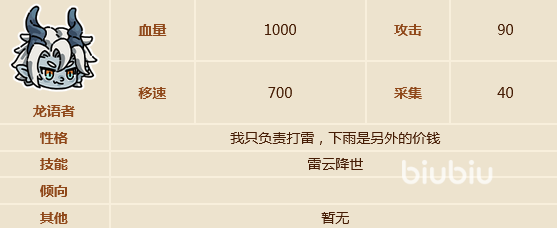 龙语者是现在非常强势的角色之一,他在一星状态下就拥有1000点血量,90攻击,700移动速度和40采集。达到二星时血量增加到1150,攻击力提升到100,三星时血量增加到1400,攻击力为120,其他属性则不变。附带的技能是雷云降世,同样有三种不同的星级效果。