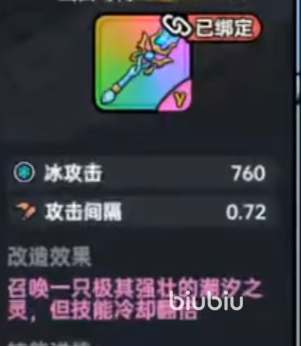 那么来看这法杖,首先要带大家看的是这法杖自身的效果,分析单件法杖的强度,从它自身的效果去看,这法杖是非常强的,它可以释放一个继承角色90%全属性的潮汐之灵辅助战斗,这是一个什么概念?