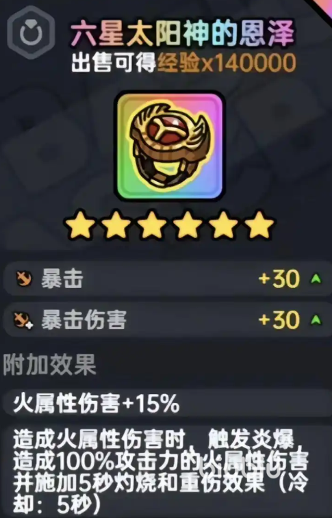 加30暴击,被动是火属性伤害提升15%,并且在自己每次对敌人形成火属性输出值时,触发一次炎爆,形成一定输出值并施加5秒的重伤和灼烧。