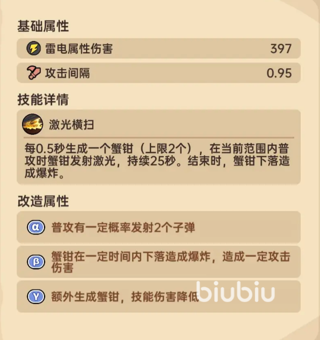 该武器的技能 “激光横扫” 是一大亮点,可以每0.5秒生成一个蟹钳,上限是2个。玩家在有效攻击范围内普攻时,蟹钳可以发射持续25秒的激光伤害。该特点适合应对PVE场景,在挑战世界BOSS的时候,激光持续输出能稳定给BOSS叠加雷伤,有效消耗血量。在技能结束时蟹钳会下落爆炸,伤害能对BOSS造成小爆发,在残血时直接带走。