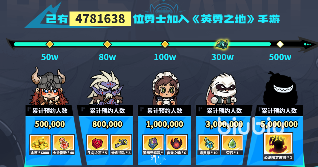 英勇之地目前预约人数爆满,新奇玩法吊足了玩家的胃口,当然游戏厂商也没有辜负玩家的一片热情,在预约期间,设置了丰富“预约里程碑”礼包,预约人数达到50万、80万、100万、300万和500万之后,分别可以获得对应的新手奖励,从设置成500万最高人数来看,距离5月22日的公测,距离500万预约目标还有点距离,而500万的限定公测皮肤,看样子是一个非常不错奖励。