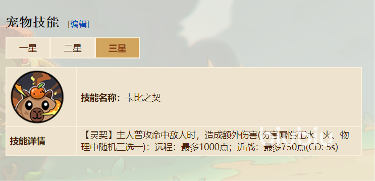 然后这只宠物的技能叫做卡比之契,当大家成功激活这个技能时,并且自己也在用普通攻击对敌人造成伤害,这时这只宠物也可以附加不同属性的伤害。另外这种伤害会在物理冰火三种之间随机选择一种,所以起到的作用更好,能够造成多元化伤害。