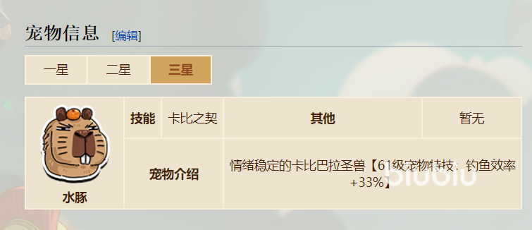 要是大家喜欢卡皮巴拉的话,可以试着了解英勇之地卡皮巴拉怎么样?虽然这是一只叫做水豚的宠物,但是他的个人描述以及形象都特别接近卡皮巴拉,所以给人一种情绪很稳定的感觉。另外他的战斗和生活能力也很强,可以造成高额伤害的同时也方便钓鱼。