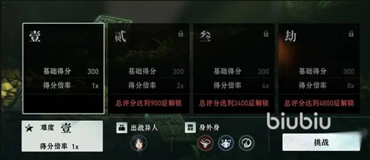 每个章节还有几档不同的难度可挑战,壹,贰,叁,劫几种,难度越高,通关后拿到的评分就越多,每个章节参与战斗时,可挑选1名异人角色,附加3个身外身技能,获得胜利后,系统会根据战斗难度,通关时间等因素综合评定分数,章节总分取最高分三名异人分数之和。