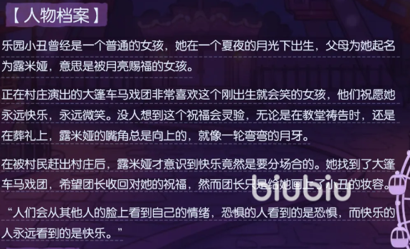 乐园小丑原本只是一个普通的小女孩,她在一个夏夜的月光下出生,父母给她取名字叫露米娅,意思是被月亮赐福的女孩,正在村庄演出的大篷车马戏团非常喜欢这个一出生就爱笑的小姑凉。