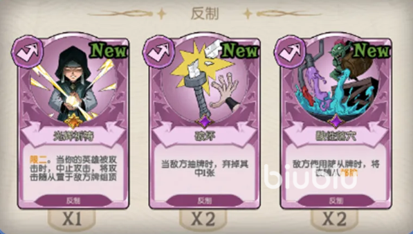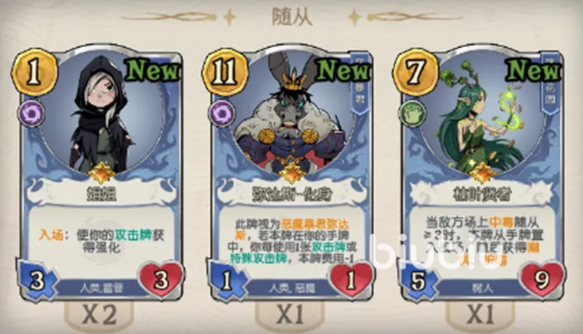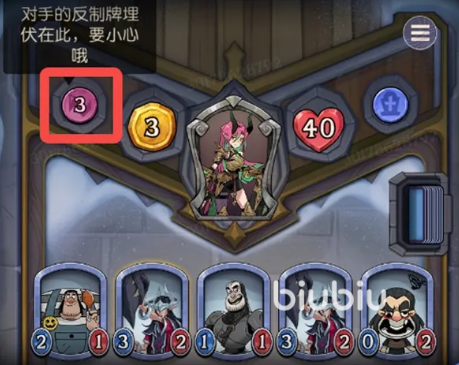 大家可以在每回合战斗界面看到敌方的阵容状况以及剩余血量,以便针对性的布置,不过要小心对手埋伏的反制牌,反制牌只能看到数量,但无法确定反制的效果,最后卡牌类型分为随从、咒术和反制,反制需要相应条件才能生效,咒术是打出后一次性生效,随从具备自己的攻击力生命值,部分会带有护盾等特殊能力。
