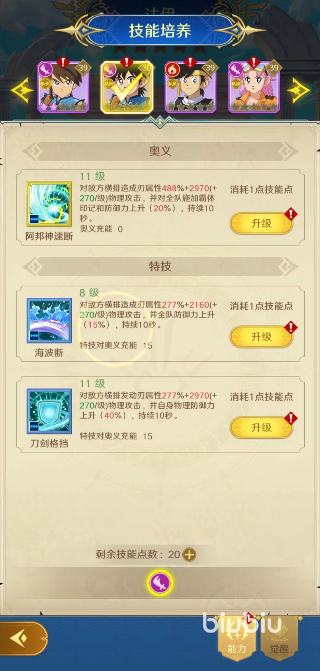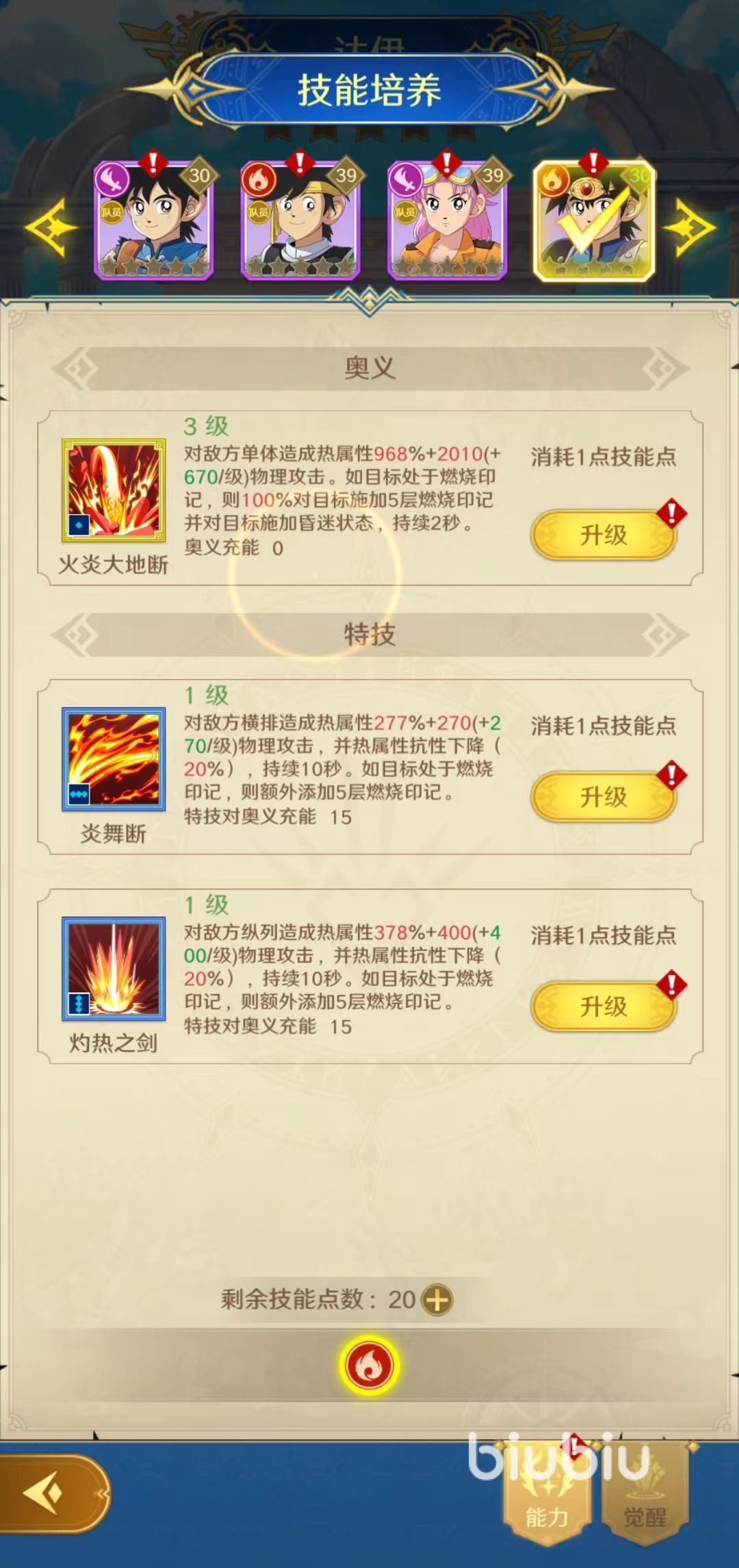 热系的达伊技能比起刃系,更加专注于热属性攻击和控制,奥义和特技都有着较高的伤害和眩晕附加效果。奥义火炎大地断可以对单体目标造成巨大的热属性伤害+魔法伤害,并有概率施加昏迷状态和燃烧印记,对于已经受到燃烧印记的目标更是具有强大的打击力。特技炎舞断和灼热之剑都可以对敌方造成横列或纵列热属性伤害,并有降低热属性抗性的效果,同时还可以额外添加燃烧印记。