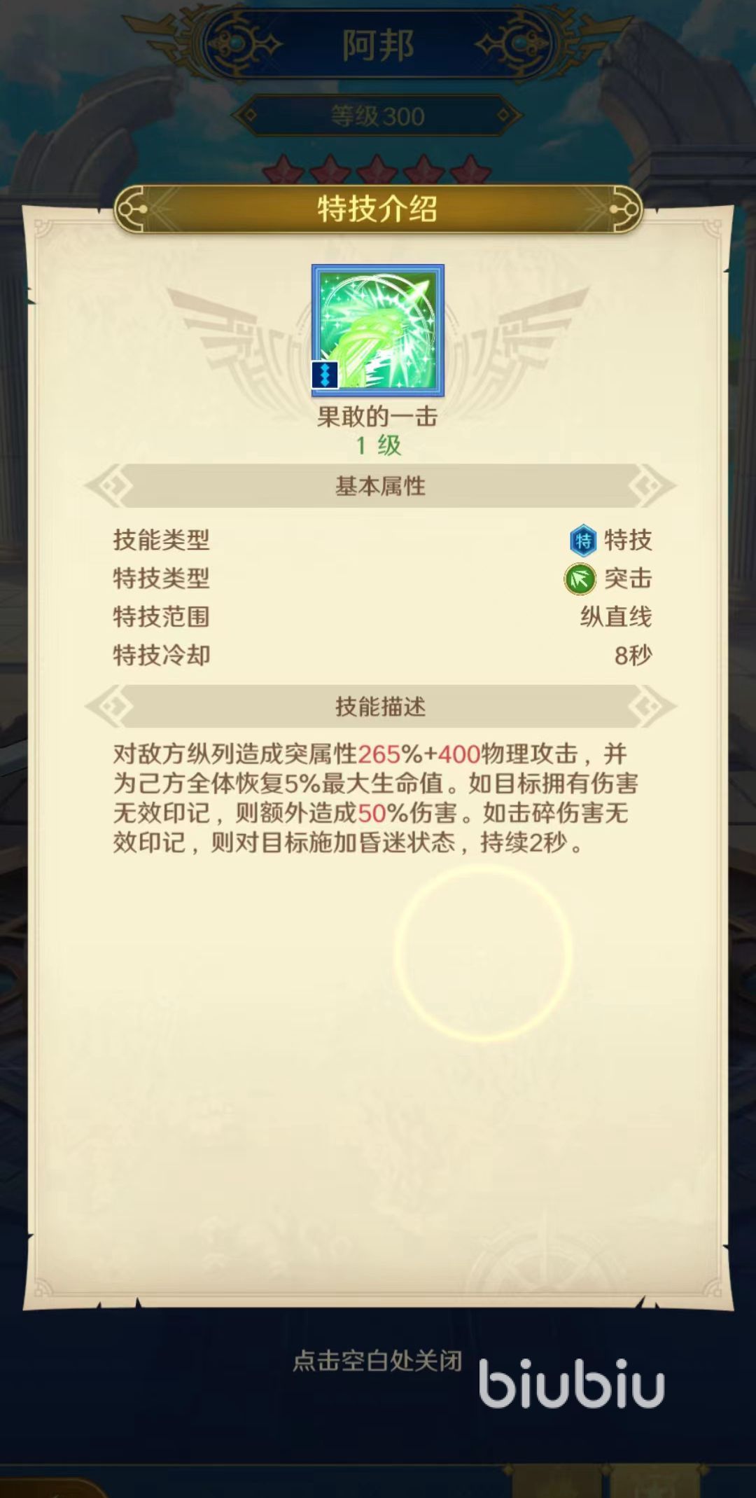 对敌方纵列造成突属性265%+400物理攻击,并为己方全体恢复5%最大生命值。如目标拥有伤害无效印记,则额外造成50%伤害。如击碎伤害无效印记,则对目标施加昏迷状态,持续2秒。