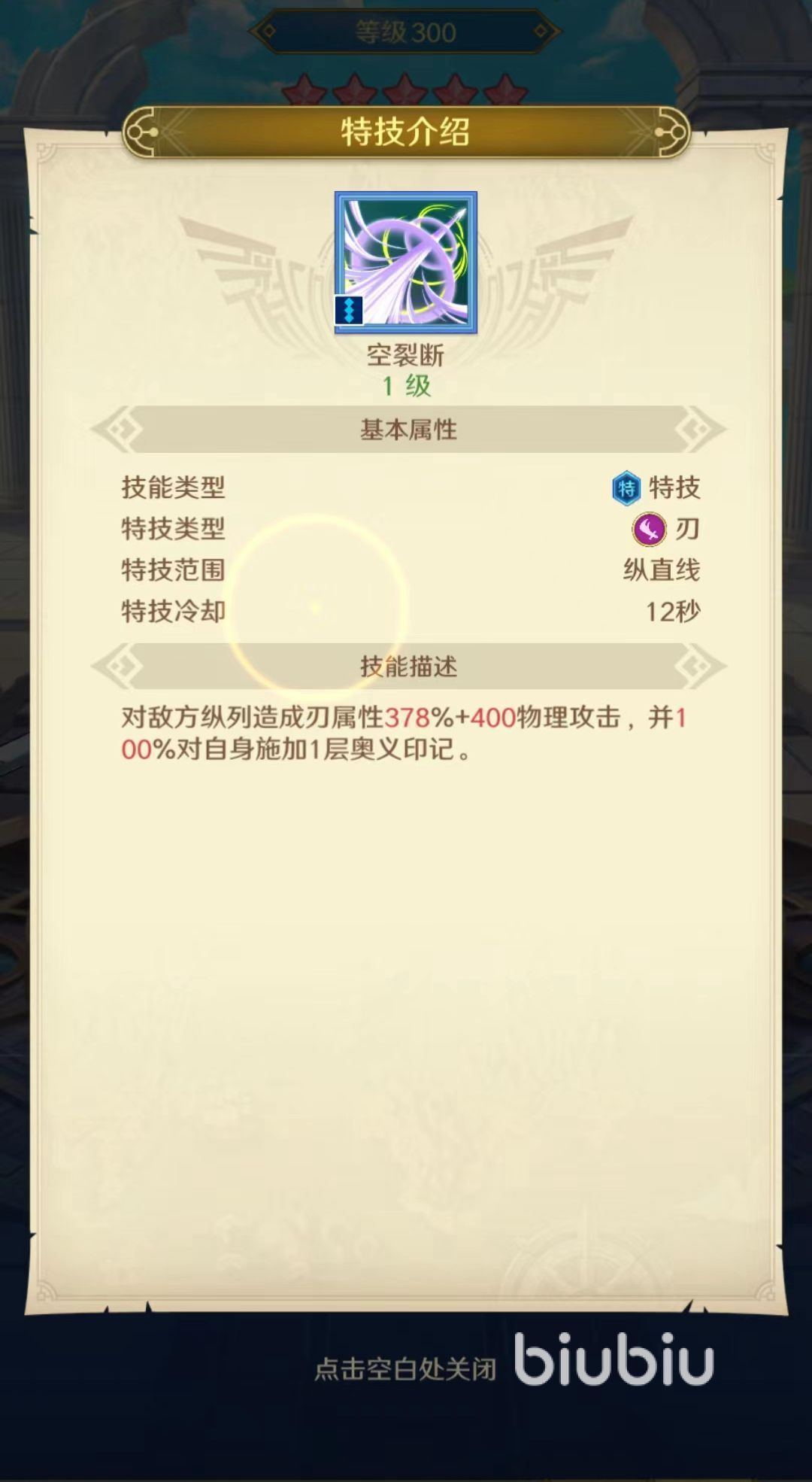 对敌方大范围造成刃属性399%+230物理攻击并有80%概率再次立即释放奥义。