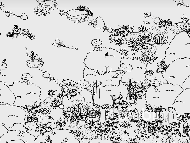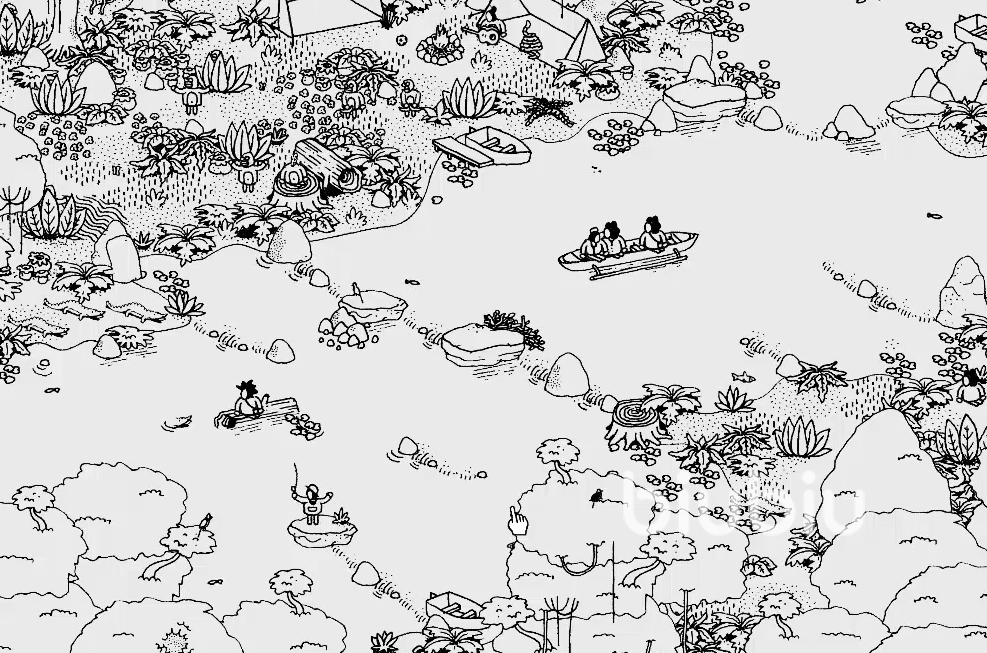 猴子的话是喜欢柔软的居所,那么它肯定在茂密的树上。我们点击左边树上方便可以找到猴子。最后一个则是找到成熟的香蕉,这个是最容易的,我们在右边的树上寻找一番便能找到了。之后我们进入到第二关,从第二关开始我们的难度会增加不少,这关的地图非常的大,我们需要非常仔细才能找到规定的人或者物。首先第一个需要找的是遇险的男人,这个提示所说的便是男人目前的状态是在遇险,我们可以在河里面寻找这个男人的踪迹。