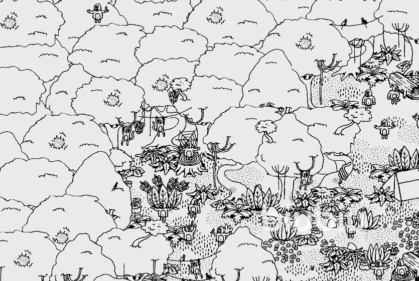 下面所找的角色是一位正在打太极的人物。整个地图上绝大部分的角色都在群魔乱舞,想找这么一位角色也确实难找。他的具体位置是在靠近右上方的位置,在一座独木桥上我们可以看到这角色正在打太极拳。下一位所给的提升很迷,只有一串尖叫声。我们只能知道找的是个猴子,我们在地图的最下面可以看到有两个猴子正在跳跃,其中右边的那个猴子就是我们所需要找的目标。