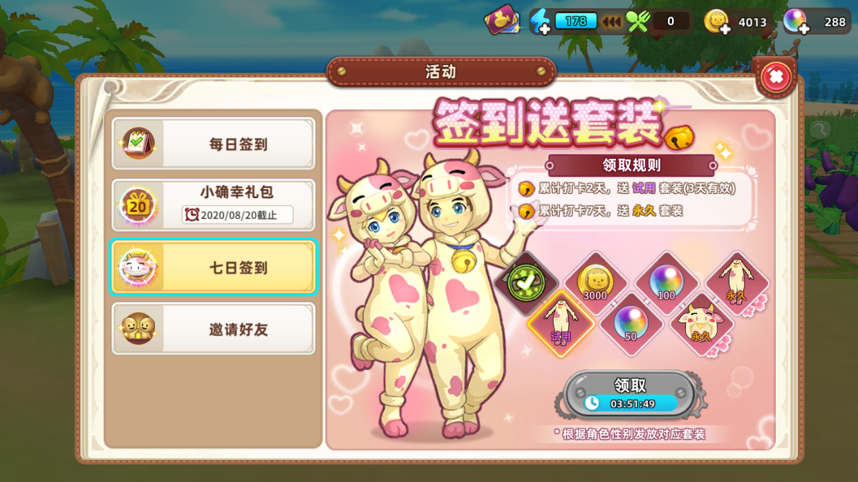 (2)活动举例:比如最新的“七日签到”活动,在签到的第一天和第二天可以得到一个限时间的奶牛时装(时间到会自动消失),当签到到第六条和第七天的时候就能得到永久的奶牛套装了。