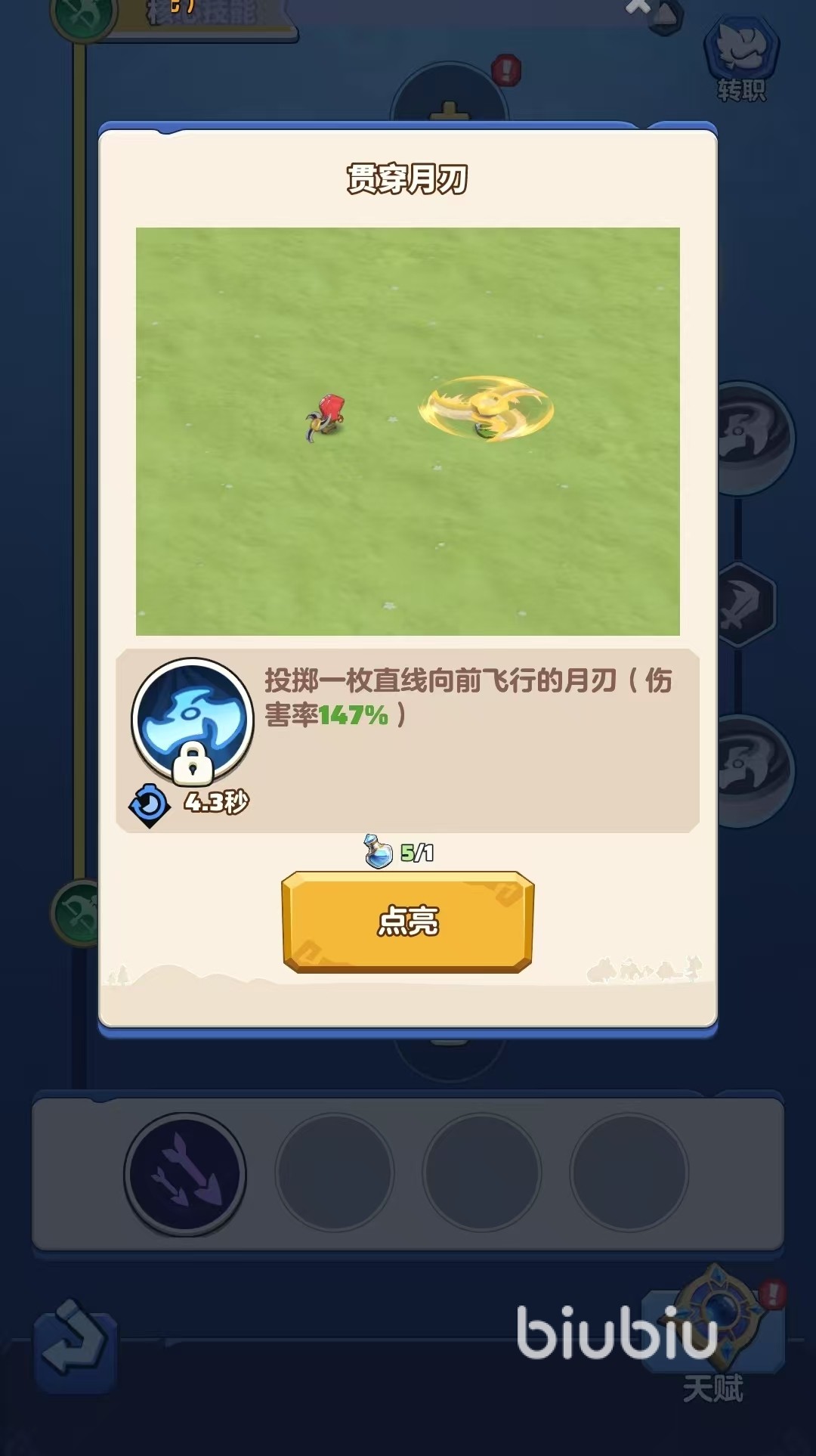 一开始,建议优先点亮基础技能。射手的基础技能有“弓箭”和“手里剑”两种,基础技能冷却快,输出稳定。如果你喜欢刷副本或清理小怪,推荐选择“手里剑”技能中的“月刃投射”,它可以攻击最多15个目标,清怪效率非常高。点亮基础技能后,你的持续输出能力会更稳定,为后续的战斗打好基础。
