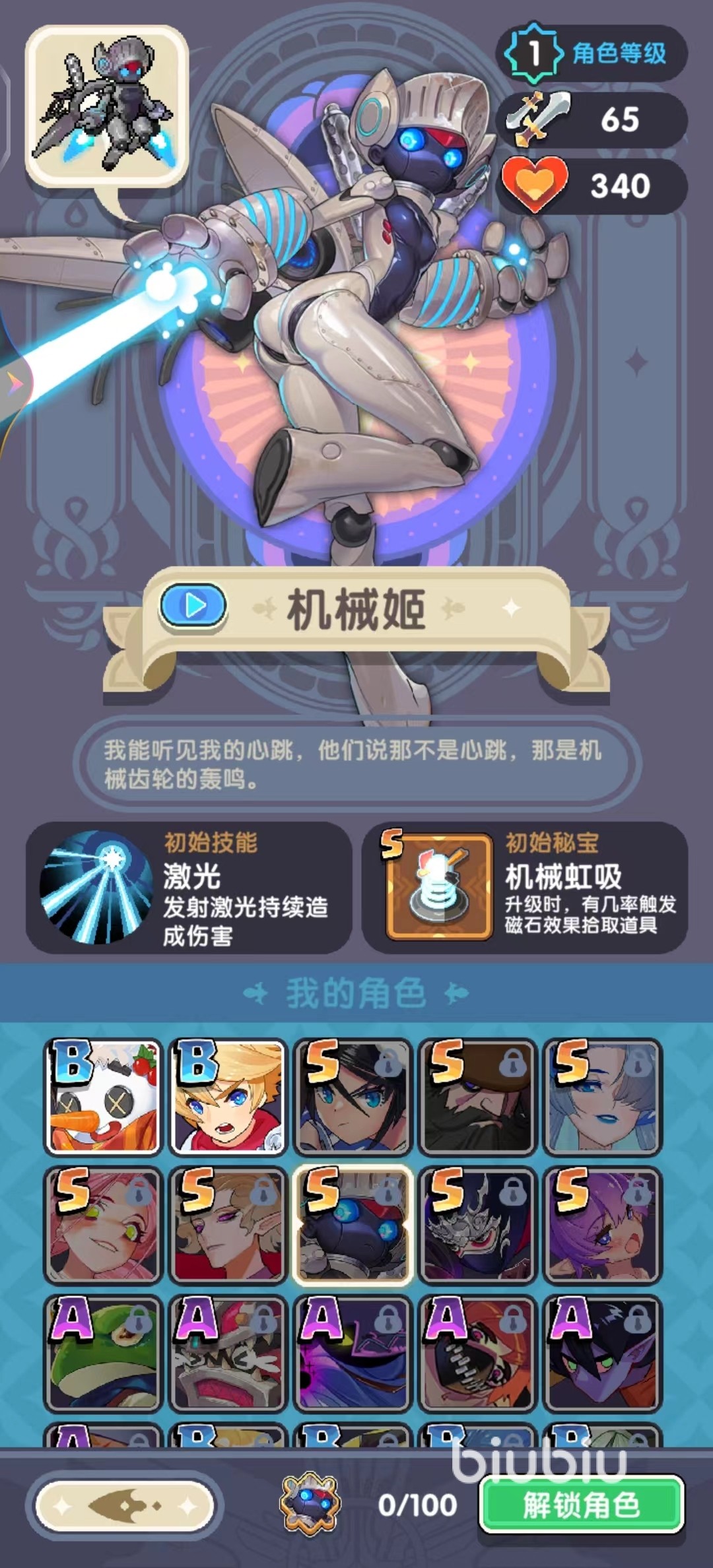 最后一个则是机械姬,机械姬是一个伤害特别高的角色,初始技能激光可以造成持续伤害,这在初始攻击都有CD的勇者秘境当中属于独一份,在初级阶段就可以对高级小兵和BOSS造成巨额伤害,是慢速敌人的天敌,再加上可以大范围拾取经验的机械虹吸,让她的升级速度远超其他角色。