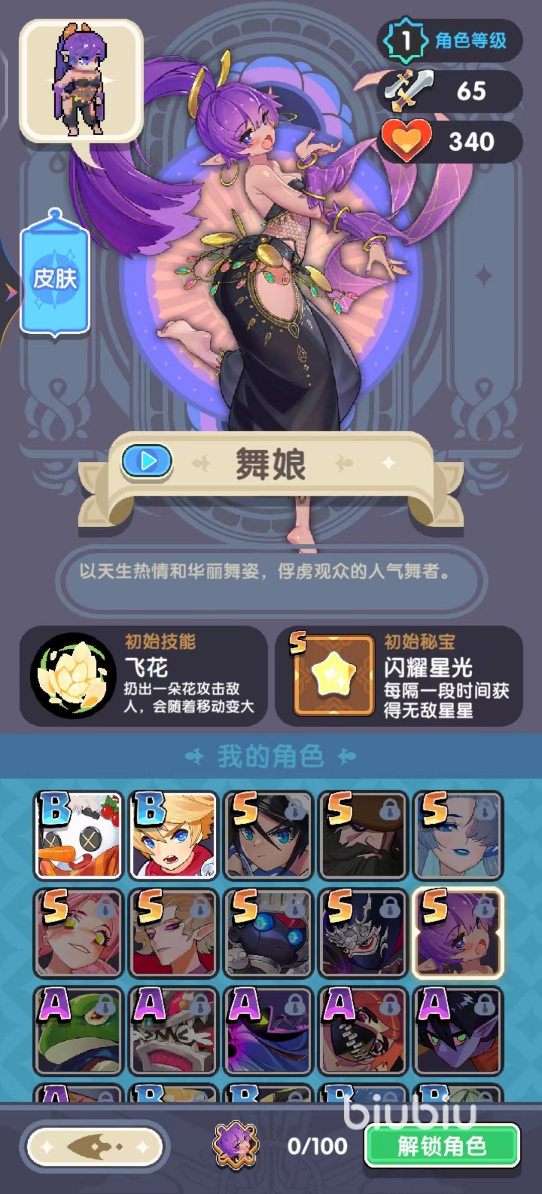 第二个就是舞娘了,舞娘是玩家在游戏前期可以试用的角色,整体实力非常强悍,初始技能飞花攻击范围大、伤害高,还可以进阶为S级技能,在各种关卡中都有非常好的表现,再加上每隔一段时间的无敌状态,让舞娘完全无惧敌人的包围,正所谓万花丛中过,片叶不沾身,是一个让BOSS绝望的角色。