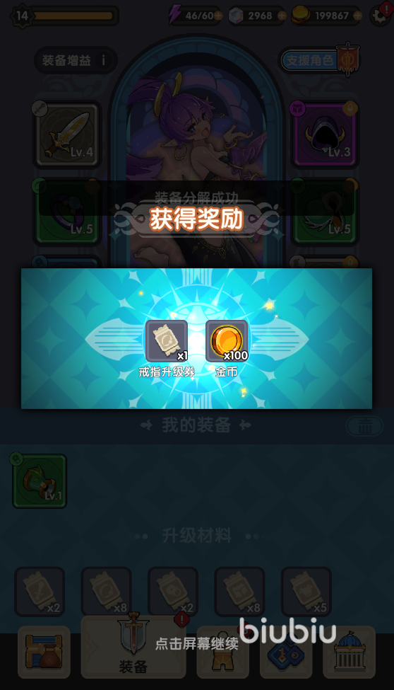 也可以批量分解,直接把闲置的装备全部分解为金币和对应类型的装备升级劵。
