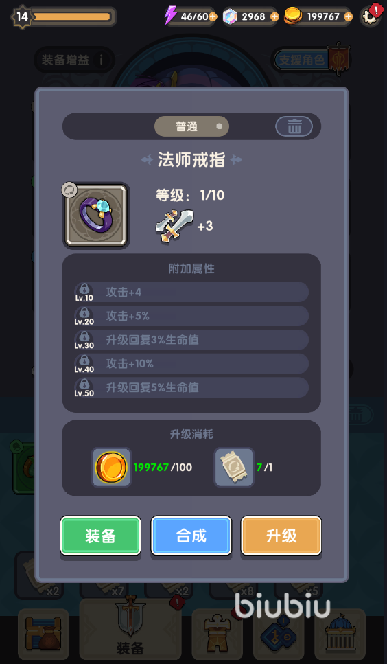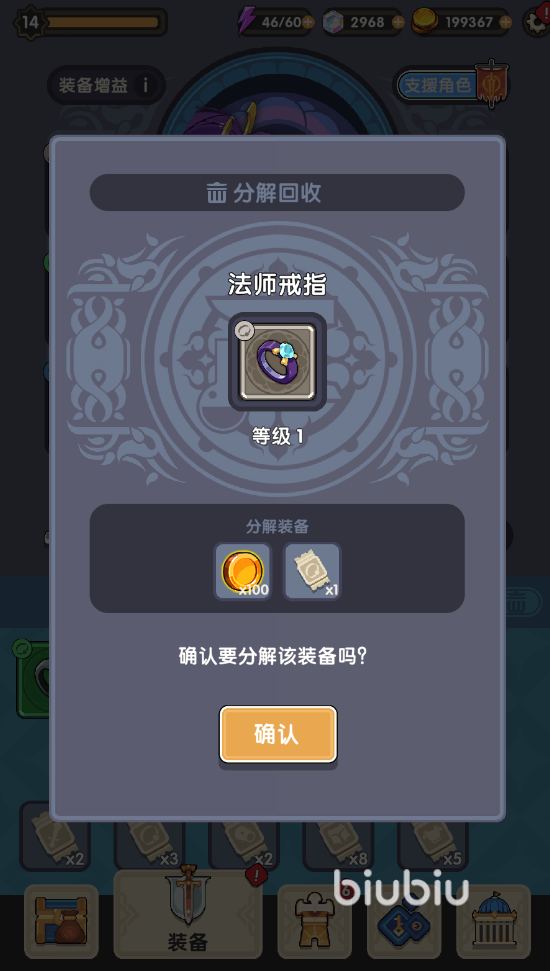 对于空闲的装备可以通过分解或者批量分解的方式变成升级材料,用于后续需要的装备提升使用。比如选择普通品质的法师戒指,可以通过选择垃圾桶的方式分解此装备,可以获得一些金币和戒指升级劵道具。分解成功后,可用于英雄目前戒指装备的提升使用。当升级后,可以提升穿戴此装备英雄的战斗力,当达到一定等级后还可以解锁相应的装备技能加成。