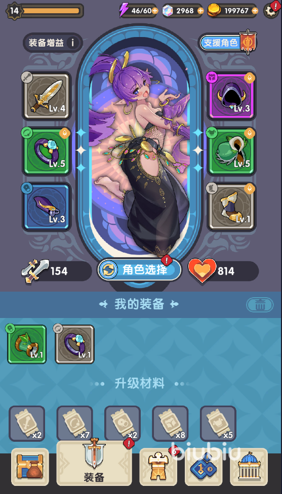 冒险者在页面中选择装备,即可展示出目前英雄角色的所有装备信息。在装备中包括已经穿戴的和空闲的装备。