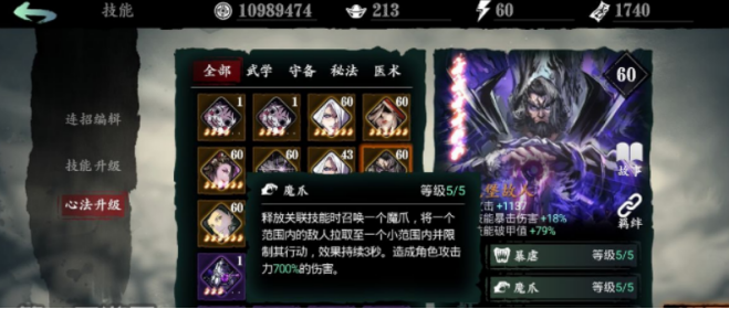 第一个绝技:魔爪,基础等级释放关联技能时召唤一个魔爪,将范围内的敌人拉取到一个范围并限制其行动,持续3秒。造成角色攻击力100%的伤害。