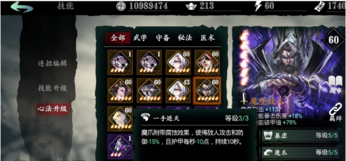 第三个绝技一手遮天,基础等级魔爪附带腐蚀的效果,使得敌人的攻击和防御减少3%,并且护甲每秒减少10点,持续5秒,一共就是5点。
